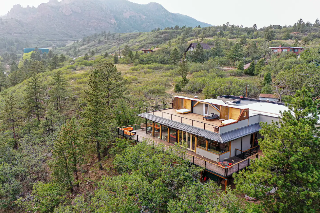 This modern home features floor-to-ceiling windows and a large folding door that erase boundaries between indoors and outdoors, offering panoramic mountain views. Relax in the reading loft or Japanese soaking tub for a quiet retreat. With decks on both levels, including a rooftop deck with lounge beds, it's perfectly located near expansive trail networks in Cheyenne Canon and Stratton Open Space, just a mile from the Broadmoor and 10 minutes from downtown.