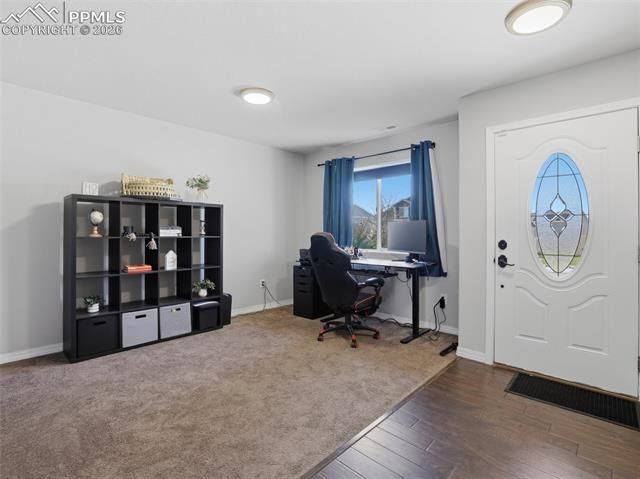 Welcome to this home in the Ventana community, where convenience and amenities come together. Residents enjoy access to the neighborhood recreation center featuring a gym, pool, playground, and miles of nearby trails. Located just minutes from the highway and Fort Carson, this home also offers a quick commute to shopping, dining, and everyday essentials. With almost 2300 square feet all above ground, this home offers a spacious and flexible layout with 3 bedrooms, 3 bathrooms, and a 2 car garage. As you enter, the front room provides a versatile space that can easily function as a home office, second living room, or playroom depending on your needs. The main living area flows into the kitchen and dining space, creating a comfortable setting for everyday living and entertaining. The kitchen features stainless steel appliances and a custom corner pantry that offers excellent storage. Updated lighting fixtures and hardware throughout the home add a modern touch. The home also includes a water filtration system and central air conditioning for added comfort. Upstairs you will find a large loft that could easily be converted into a fourth bedroom if desired. The laundry room is conveniently located on the upper level near the bedrooms. The primary suite features a huge walk in closet and a spacious bathroom that includes an added cabinet for extra storage. Step outside to enjoy the backyard with a large concrete patio, pergola, and a walkway that connects to the front yard. Turf in the front yard adds curb appeal while keeping maintenance low. From the upper level you can also enjoy beautiful views of the mountains. A new roof and gutters were just installed, providing peace of mind for the next owner. This home offers space, flexibility, and great community amenities in a location that makes commuting and daily life easy.