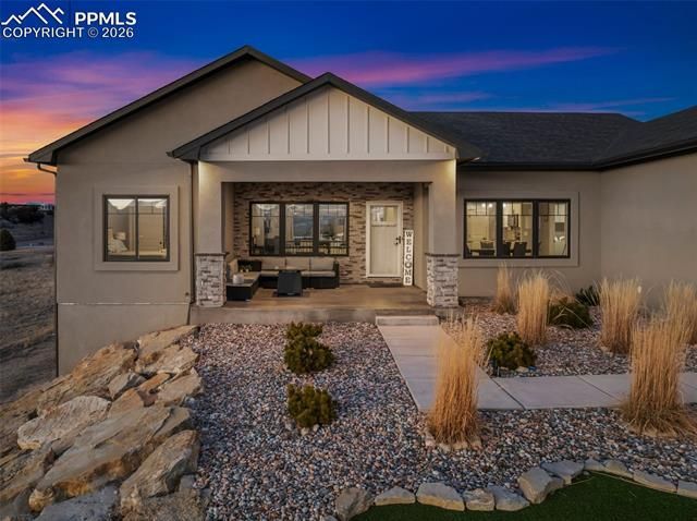 Your dream home is now available in Pueblo West! Prepare to fall in love with this gorgeous single-owner Liberty Point home, built in 2021 with 6 bedrooms, (plus office), 4 bathrooms, with over 4000 square feet, and an oversized 3-car attached garage! Perched high on a 1.21 acre parcel, with concrete driveway, RV parking, and excellent views of Pueblo Reservoir and the surrounding mountain ranges. Step inside to discover the airy and open-concept floor plan with lofted ceilings and a large gourmet kitchen with granite countertops, marble mosaic tile backsplash, stylish pendant and LED lighting, kitchen island with breakfast bar, durable laminate flooring, and a corner pantry. All stainless-steel kitchen appliances are included! Enjoy the sunny dining area, and the beautiful modern gas fireplace in the living room complete with mantle and stone hearth. The split-bedroom layout features a spacious primary bedroom suite, with a huge walk-in closet, 5-piece bath with separate soaking tub and roomy walk-in shower. Step outside to the back patio to enjoy the private backyard and stunning views, featuring water-friendly artificial grass and easy-to-maintain vinyl fencing. Sprinkler system is installed in the backyard if needed for a future lawn, and drip lines service the bushes in the xeriscaped front yard and trees in the back. More reasons to love this home - efficient Anderson windows with electric blinds, central air conditioning, Rinaii tankless hot water heater, stamped concrete covered porch, and granite in all bathrooms! Also features 9’ ceilings in the full basement with large family room, 3 more bedrooms, plus an office/work-out/bonus room (could be 7th bedroom, has egress, but no closet), and plenty of extra storage in the 519 sq ft unfinished utility/storage room. Come see for yourself—this home is in pristine, like-new condition, and is move-in ready for its next lucky owner!