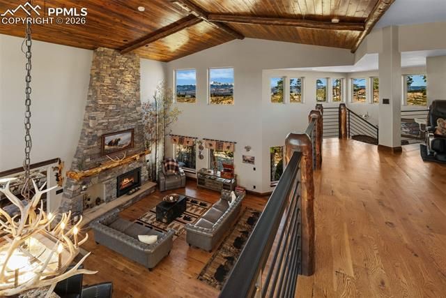 Set on 4.83 fenced acres in the heart of Black Forest, this custom home offers warmth & character while telling a powerful story of renewal after the 2013 Black Forest Fire. Thoughtfully built from the ashes & the land itself, the home incorporates reclaimed timber from the original trees, creating a one-of-a-kind residence rich in history, craftsmanship, & natural beauty. Soaring reclaimed wood ceilings & a loft immediately evoke the feel of a grand lodge retreat & the open-concept centers around a stunning floor-to-ceiling stacked stone fireplace & handcrafted mantle also made from reclaimed wood found on the property. Log newel posts & a custom wrought iron staircase continue creating a contemporary mountain theme. The great room flows seamlessly into a chef’s kitchen designed for everyday living & entertaining. Features include Level 5 granite countertops/island, stainless steel appliances, copper sink, & abundant workspace. Large windows fill the home with natural light while framing views of Pikes Peak. Just off the kitchen, a spacious deck provides the perfect setting for outdoor dining & gatherings. The primary suite offers a private retreat with its own covered patio—an ideal spot to unwind and watch sunsets over Pikes Peak. A fully finished walkout basement adds incredible flexibility with a large family room, bar area, full bathroom & has a separate entrance and driveway making it ideal for rental income or multigenerational living. A reinforced concrete armory/safe room + metal fire door offers a secure space perfect for hobbyists & collectors. The property itself continues the story of restoration with newly planted Aspen, Austrian Pine, Scrub Oak, Blue Spruce, and Juniper beginning to flourish across the landscape. With no HOA, covenants, or water restrictions, owners enjoy freedom & privacy here. It's more than a home—it’s a legacy property where resilience, craftsmanship, and Colorado beauty come together in an unforgettable Black Forest setting.