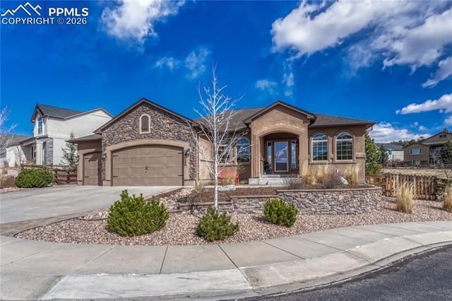 Welcome to this beautifully maintained 5-bedroom, 3-bathroom ranch-style home nestled in the heart of Monument, Colorado. This spacious residence offers over 3,000 square feet of comfortable living space, featuring an open-concept layout that seamlessly connects the living, dining, and kitchen areas—perfect for everyday living and entertaining. The cozy gas fireplace creates a warm environment to enjoy. The main-level primary suite is perfectly situated with a private en-suite bath, generous closet space, and natural light throughout. The fully finished basement provides 3 additional bedrooms, a large recreation room, and plenty of storage. This home also includes a 3-car garage for ample parking, access to the backyard and more space for storage. Sellers just replaced the hot water heater and the dishwasher. This property is located on a cul-de-sac with views of Pikes Peak, the entire front range and the Air Force Academy. The backyard is beautifully landscaped to maximize privacy, allowing you to enjoy the outdoor patio on lovely summer evenings. This home is located close to schools, parks, and shopping with convenient access to I-25 for easy commuting. Located in a peaceful community with stunning views of the Front Range, this home combines comfort, space, and convenience in one exceptional package. Come see this beautiful home for yourself.