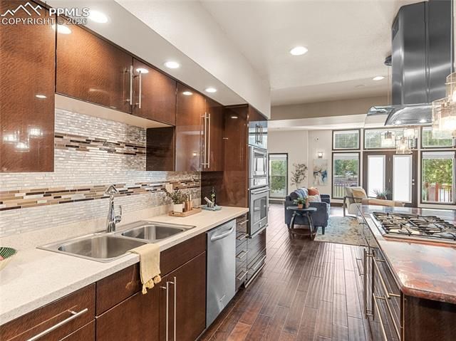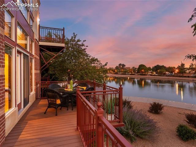 This exceptional end-unit townhome offers front-row living in one of downtown Pueblo’s most exclusive settings. One of only seven side-by-side residences (and among the largest) this four-level home captures panoramic views of Lake Victoria and the Riverwalk while delivering space, privacy, and flexibility rarely found in urban living. From the moment you enter through your fully enclosed, secure two-car garage, keypad-locked storage, and room for up to two additional vehicles, it’s clear this property stands apart. The main level is designed for gathering. Engineered hardwood floors run throughout, connecting a versatile dining space (equally suited for a home office or library) to a chef-forward kitchen with oversized island, gas cooktop, double wall ovens, generous pantry storage, and seamless flow into the living area. A gas fireplace and expansive windows frame the water views, while glass doors open to a wraparound deck offering both secluded morning coffee moments and open-air entertaining space above the Riverwalk. The second level balances everyday comfort with retreat. Two bedrooms, full bath, and laundry accompany a tranquil primary suite overlooking the water, featuring a walk-in closet, spa-style bath with soaking tub, walk-in shower, dual sinks, and a private balcony. At the top, an entire level is devoted to possibility. Media room, guest suite, executive office, or entertaining lounge, complete with wet bar, beverage refrigerators, updated bath with spa shower, walk-in wardrobe with built-in wall safe, and an expansive south-facing deck positioned perfectly for seasonal lights, and fireworks over the Riverwalk. Thoughtfully constructed with future elevator or dumbwaiter capability, the home offers long-term livability and adaptability. Restaurants, shops, festivals, and riverfront paths are just outside your door, delivering a lock-and-leave lifestyle that feels like a vacation all year long.