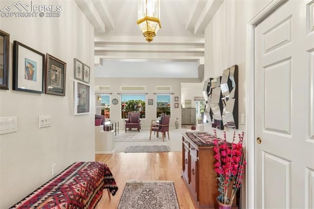 Beautifully landscaped with clean architectural lines, this elegant ranch-style home is nestled within the private, gated 55+ community of La Scala. Designed for effortless main-level living, it also offers a spacious, fully finished lower level, perfect for guests, entertaining, or family visits. Upon entry, you’ll immediately notice the attention to detail and quality craftsmanship throughout. Rich hardwood floors, coffered ceilings, and architectural design elements create a warm yet sophisticated atmosphere. The grand entry opens to a light-filled great room featuring newer Pella windows, a three-sided fireplace, and access to an oversized, partially covered deck which is ideal for outdoor relaxation and gatherings. The dining area flows seamlessly between the great room and kitchen. The gourmet kitchen is fully equipped with top-of-the-line appliances, oversized cabinetry, an enormous pantry, expansive slab countertops, and stylish designer finishes. The updated primary suite offers a serene retreat with a spa-like ensuite bath featuring a separate standalone shower, jetted tub, dual vanities, and a walk-in closet. A second main-level bedroom includes its own private full bath, while a dedicated study, half bath, and laundry room complete the main floor. The finished two-car garage, with treated floors, connects conveniently to the laundry room. The garden-level basement is equally impressive, boasting two large family rooms, a wall of custom cabinetry for an entertainment center, a wet bar, and a cozy gas fireplace. Two additional bedrooms share a connecting bath, and a large, finished space provides the perfect area for exercise, hobbies, or storage. Ideal for a live-in caretaker! Recent updates include a newer furnace, radon system, stucco exterior, tile roof, and windows. Ideally located near shopping, Quail Lake, and with easy access to I-25, Hwy 115, Fort Carson, and downtown, La Scala is a highly desirable community, an exceptional place to call home.