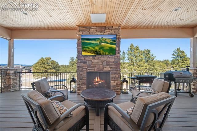 Tucked away on nearly three acres of mature pine trees & open space, with sweeping 180-degree views of the Front Range & year-round sunsets, this custom home, affectionately called Pine Haven by its owners, offers a rare sense of privacy and quiet. Designed by a well-known local architect, Pine Haven carefully balances thoughtful interior design while inviting outdoor living with its wrap-around porch. Inside, the open-concept main level boasts sky-high ceilings, a gas fireplace with stone surround, and a layout that seamlessly connects the great room, dining area, and gourmet kitchen. The luxury kitchen features JennAir appliances, including an induction cooktop, double ovens, oversized refrigerator, abundant cabinetry, walk-in pantry, solid live-edge counters, custom-tile backsplash, convenient pot faucet, and beverage fridge. Pine Haven's northeast alcove houses the primary suite, complete with a private viewing deck perfect for taking in Colorado’s cotton-candy sunrises. The ensuite bath features a two-person soaking tub, walk-in shower, dual vanity spaces, and a custom walk-in closet with specialized shelving & drawers. Pine Haven’s main level also includes a dedicated office or bedroom with attached bath, mudroom, dog wash, and a laundry area with cabinetry and folding countertop. The expanded-bay four-car garage is a workshop lover’s dream, offering generous floor space & ceiling height for vehicles, storage solutions, and hobby space. But wait, there's more! Above the garage, an additional 1,200 sq ft of unfinished space offers flexibility for your needs. The walkout lower level expands the living space with a dining and entertaining area with wet bar, along with three additional bedrooms, two with an adjoining Jack & Jill full bath, and an added bath space. Located on a quiet cul-de-sac in the high-end Majestic Pines community, Pine Haven offers space, privacy, and convenient access to amenities, schools, restaurants, and both Colorado Springs and Denver!