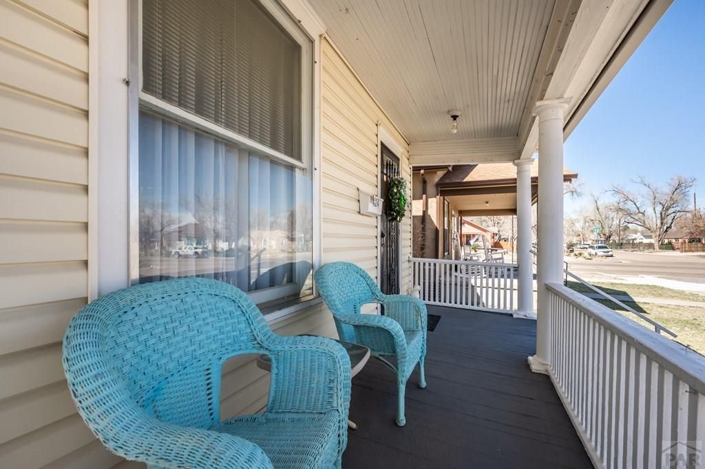Classic, Turn of the Century home located in the desirable Historic Central High School area. This well maintained home offers 960 sq. ft. of finished living space and is located on two lots. Features an ample sized living room with adjoining dining room, separated by the "Tudor Revival" style pointed archway. Enter the well planned Kitchen, also with the "Tudor Revival" pointed archway, and enjoy lots of cabinetry and counter top space for plenty of storage. Gas range oven and side by side refrigerator are Stainless Steel, dishwasher is black. Both nice sized bedrooms have their own private, full sized bathroom entry. Rear bedroom with walk-in closet. Main level laundry room gives access to the basement that has a separate storage room, updated with a quality Lennox furnace. Rear yard with two opposite facing covered patios. One for relaxing mornings, the other provides shade for the upcoming warm weather. Car lovers will certainly appreciate the oversized, heated detached garage that includes three work benches. You can work on your Hot Rods or Muscle Cars year round. Roof was installed in 2024 by a licensed roofing contractor. New siding has been installed since current owner purchased. Healthy lawn is serviced by front and rear sprinkler systems. No need to leave your puppies inside, the fenced dog run is an added bonus! Central location is very close to Pueblo Community College, Mesa Junction, River Walk, Union Ave. or Downtown. Be on I-25 in about 10 minutes or less