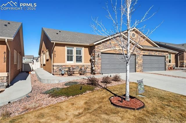 Lovely paired patio home in the pristine, low-maintenance Trails East community - perfect for simplified, carefree living! With beautiful curb appeal from its stucco and stone facade, the home benefits from full HOA-provided front lawn care (including watering) and snow removal in the winter. Step inside to true main-level living with an open layout, vaulted ceilings, beautiful hardwood plank floors throughout the kitchen, dining, and living areas, a cozy gas fireplace, plantation shutters, and decorative art niches. The gourmet kitchen has stainless steel appliances including a gas range, granite countertops, tile backsplash, a breakfast bar, and a walk-in pantry. In the spacious primary bedroom, you will find an ensuite bathroom with dual vanity, large shower, and a generous walk-in closet. Also on the main level: a bright and sunny office/study, a powder room, a laundry closet, direct access to the rear patio, and entry to the attached two-car garage with overhead storage. Downstairs, the fully finished basement doubles your living space with a large family/entertainment room, two additional bedrooms, a full bathroom, and a highly desirable, dedicated storage room. Outside, enjoy the fully fenced, xeriscaped (zero-maintenance) rear patio area with views of Pikes Peak. A newer roof (installed summer 2024) adds extra peace of mind. This quiet and peaceful community features LOW HOA dues and a convenient location with quick access to Powers corridor amenities, nearby parks, shopping, restaurants, schools, hospitals, and a short commute to Peterson Space Force Base via Marksheffel Road. Central air conditioning keeps you comfortable year-round, and the refrigerator, washer, and dryer are included. If you're ready to simplify your life, eliminate yard work and snow shoveling, and spend more time enjoying what matters most—this lovely home is a must-see!