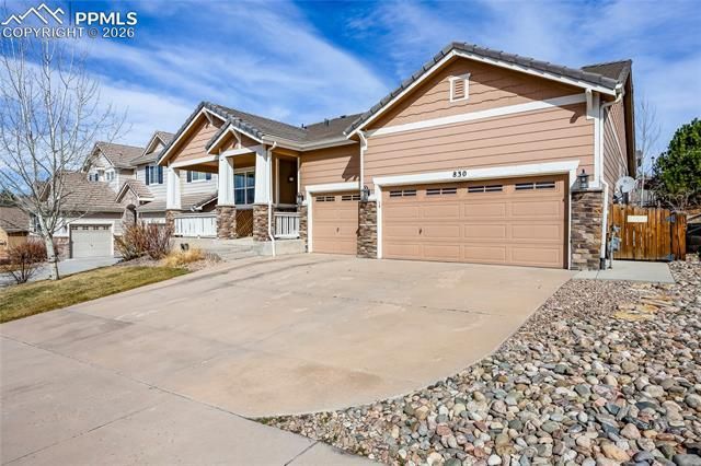 Beautifully updated Northgate ranch offering main-floor living with stunning views of Pikes Peak and the Front Range. This spacious home features 3 bedrooms plus a dedicated office, or enjoy the flexibility of using all spaces as 4 bedrooms. The open great room showcases vaulted ceilings, fresh interior paint, and new 4-inch matte plank flooring throughout the living room, kitchen, dining room, and office. Elegant 7-inch crown molding, tall baseboards, and new plantation shutters add a refined touch. The primary suite includes two walk-in closets, a 5-piece bath, and private WC. The dining room features a tray ceiling, and the kitchen opens to a covered back patio with a hot tub pad and freshly painted railings. Enjoy a large covered front porch with views of Pikes Peak and the Air Force Academy. Additional features include central air, natural gas heat, main-floor laundry, and a 3-car garage. The full unfinished basement offers 9-ft ceilings, bath rough-in, and architectural drawings for future finish. Located near parks, schools, shopping, and more, this home combines comfort, updates, and incredible mountain views.