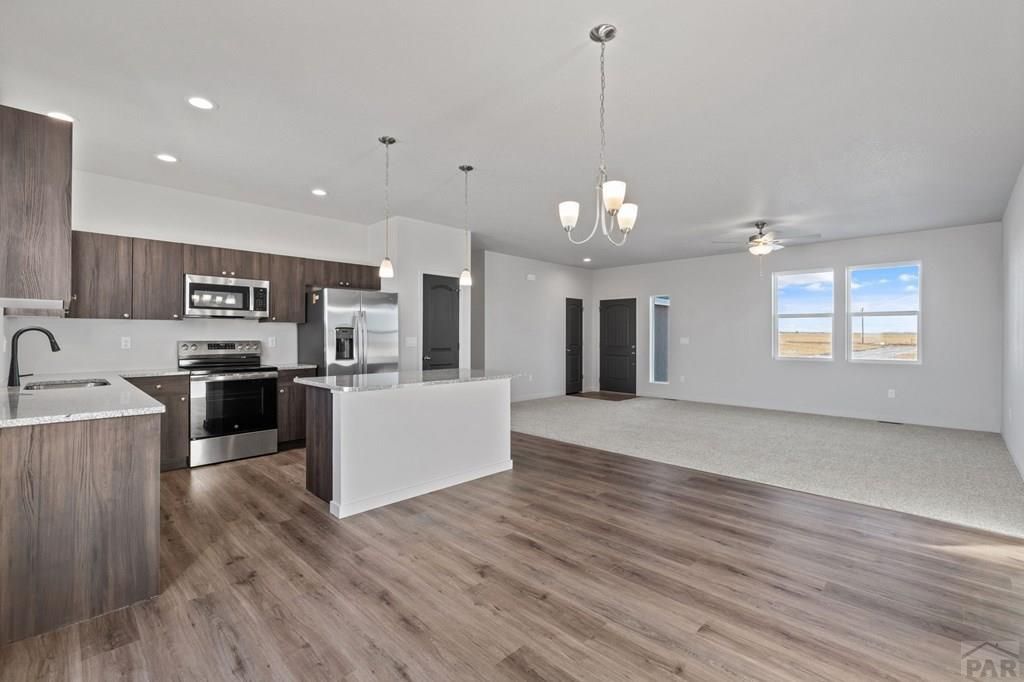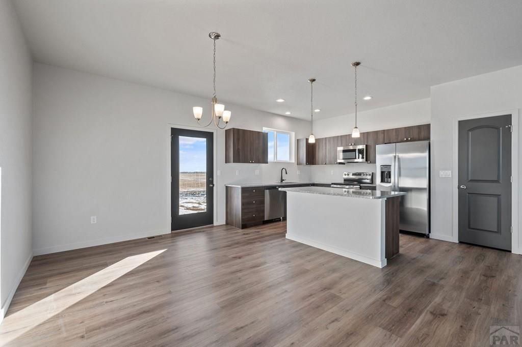 Experience the perfect balance of open-concept luxury and high-tech efficiency at 916 E Platteville. This stunning 1,680 sq. ft. ranch-style home sits on a level 1.0-acre lot, offering the space and privacy that define the Pueblo West lifestyle. Inside, 9-foot ceilings create an expansive feel throughout the heart of the home. The gourmet kitchen is a showstopper, featuring sleek granite countertops, a massive social island, premium GE appliances, and abundant storage. Designed for both durability and comfort, the layout flows seamlessly from luxury vinyl flooring into cozy, plush-carpeted bedrooms. The primary suite serves as a true sanctuary, boasting an elegant 5-piece master bath with a deep soaking tub and a walk-in shower. Built for the Future: This fully electric home features a modern, High-Efficiency Heat Pump for whisper-quiet, year-round climate control and lower utility costs. The exterior is finished in timeless, low-maintenance stucco, complemented by an oversized 3-car garage perfect for vehicles, hobbies, or Colorado gear. Quality Construction: Peace of mind comes standard with a professionally engineered crawl space, complete with a full vapor barrier to ensure a clean, dry, and protected environment. Discover the "Harmony" of space, style, and modern innovation.