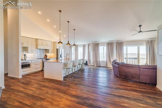Rare acreage + true move-in-ready mechanics + a 2022 showpiece kitchen. Set on ~6.71 acres at the end of a cul-de-sac in The Meadows, this 1.5-story home backs to State Trust Land/open space for an open-sky feel, low light pollution, and Pikes Peak + mountain views. The main level was opened up with a complete 2022 kitchen remodel featuring quartzite counters, a large island with seating, white shaker cabinetry, tile backsplash, designer pendant lighting, warm gold-toned hardware/fixtures, plus a microwave drawer, electric range with hood vent, and stainless appliances (2022). Two gas fireplaces, surround sound, and a wet bar add comfort and entertaining flexibility. This layout delivers two primary suites (including a main-level suite) and a major convenience win: every bedroom has an adjoining bath. The garden-level basement is ~95% finished, offering excellent space for guests, hobbies, and everyday living. Big-ticket updates are already handled: two new 50-gallon water heaters (2021), two new HVAC systems (2024), two AC units, and two Ecobee smart thermostats. Outside, enjoy room for horses (RR-5) and the 2022 concrete basketball half-court. Well + septic.