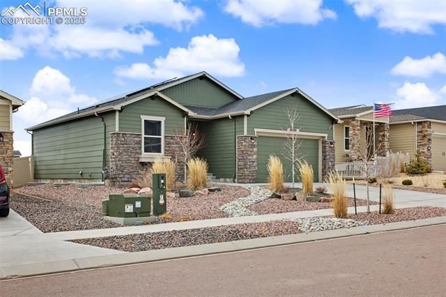 Beautiful ranch-style home built by Campbell Homes (Model 1305 Augusta) featuring breathtaking Pikes Peak views and low-maintenance xeriscape landscaping . This open-concept floor plan offers a spacious great room and a well-appointed kitchen with a large center island, ample cabinetry, and included window coverings throughout. The garage includes a 220V outlet ready for electric vehicle charging. Enjoy peace of mind with a professionally installed Vivint security system featuring a patio camera, doorbell camera, garage camera with motion sensors, and entry/window sensors throughout the home that trigger alarm notifications. Move-in ready with modern finishes and thoughtful upgrades, this home combines comfort, efficiency, and security in a desirable setting.